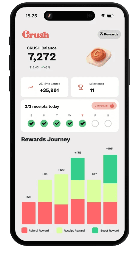 Crush is the rewards app that pays you real, liquid tokens for the shopping data you already generate. Share verified purchases. See your earnings. Use them how you want.